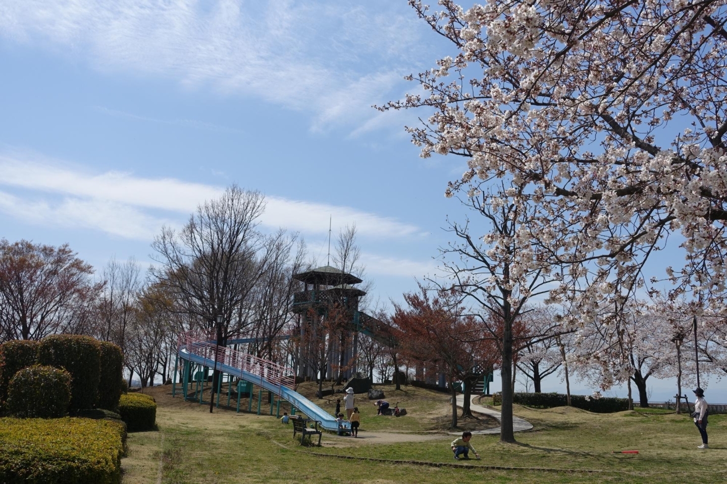 長ーいローラーコースターやスカイロープが人気の公園。親子で楽しめるお花見スポット