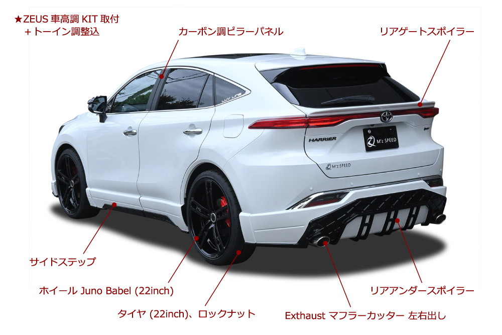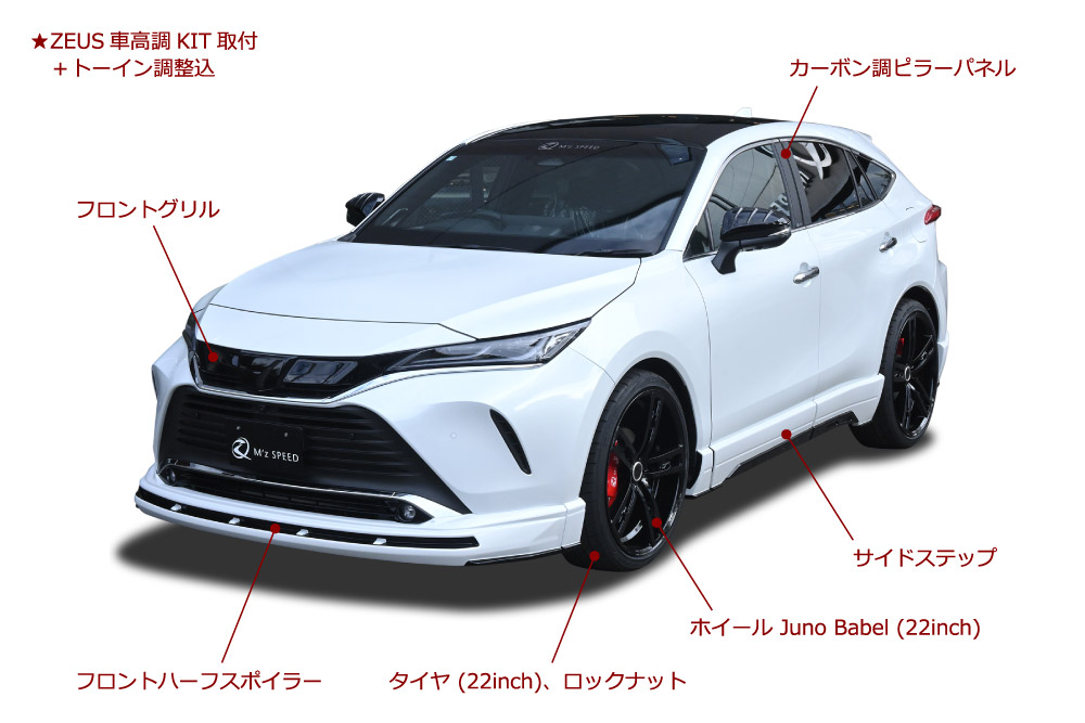 ダウンサスバージョンⅡと比較して下記装備がお得 ABS製フロントグリル VerⅡ ピアノBK ZEUS車高調KIT Juno バベル 22インチホイール AES製リアゲートスポイラー AES製カーボン調ピラーパネル
